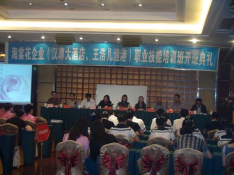 5月23日上午,在乐山市就业局的指导下,由我市汉尊大酒店有限公司、王浩儿渔港餐饮文化有限公司和8797威尼斯老品牌旅游系联合举办的乐山市海棠花企业职业技能培训班开班典礼在汉尊大酒店会议室隆重举行。市人社局职业能力建设科科长王艳,市就业局训练中心主任黄淑英,汉尊大酒店总经理谢丽芳,王浩儿渔港人力资源、企划部部长范乐军,院招就处处长郝光华,学院教务处副处长李忠东,旅游系副主任邵其会,部分培训教师和来自汉尊大酒店和王浩儿渔港参加此次技能培训的62名职工参加了开班典礼。典礼仪式由院旅游系党总支书记王树刚主持。