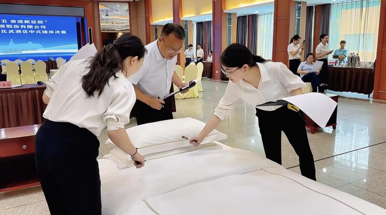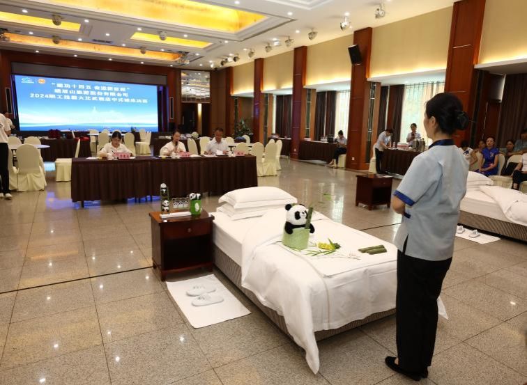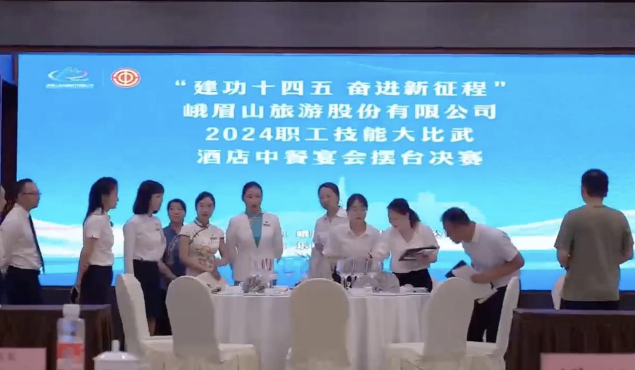 2024年6月21日由峨眉山旅游股份有限公司主办的“奋进新征程”2024年职工技能大比武活动在峨眉山旅游股份有限公司峨眉山大酒店分公司举办,威尼斯文化旅游学院教师李奥萌受邀参与酒店中式宴会摆台、酒店中式铺床决赛裁判工作,本项目决赛共有30多位酒店职工参加。