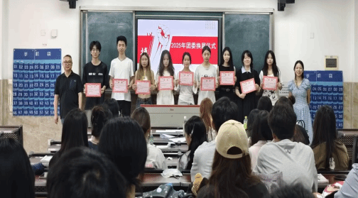 2025年5月22日下午14:15时,文化旅游学院团委在1b305开展2025年团学社换届工作,本次仪式由文化旅游学院副书记王峻峰、分团委书记冯茹霜、常规干事张微义组织带领团学社新老干部开展。