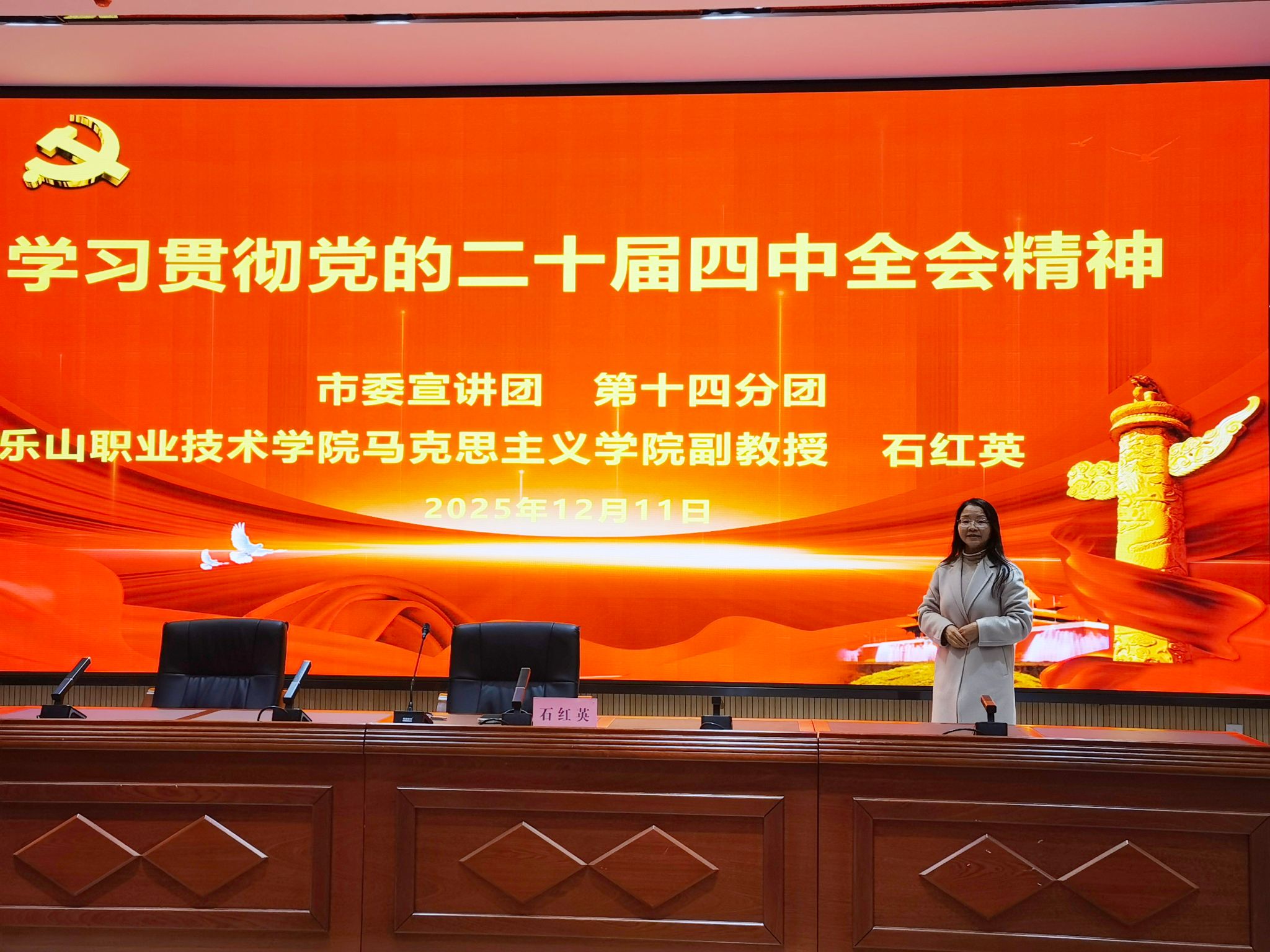 12月11日下午,乐山市第一职业中学在学校学术报告厅举行“学习贯彻党的二十届四中全会精神”专题讲座。市委宣讲团成员、8797威尼斯老品牌马克思主义学院石红英副教授应邀为学校近200名师生代表作专题辅导报告。