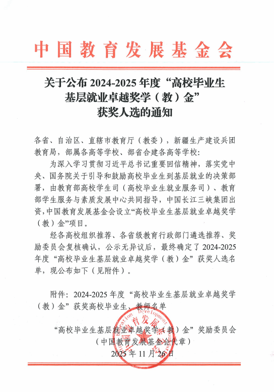 “高校毕业生基层就业卓越奖学(教)金”由教育部高校学生司(高校毕业生就业服务司)、教育部学生服务与素质发展中心共同指导,中国长江三峡集团出资,中国教育发展基金会设立,旨在贯彻落实党中央、国务院关于引导和鼓励高校毕业生到基层就业的决策部署,奖励赴基层就业创业并作出突出业绩的普通高校毕业生和普通高校指导服务大学生赴基层就业工作有突出贡献的教师。2025年,全国共有418名优秀高校毕业生获此殊荣,其中,四川省高校仅20名。