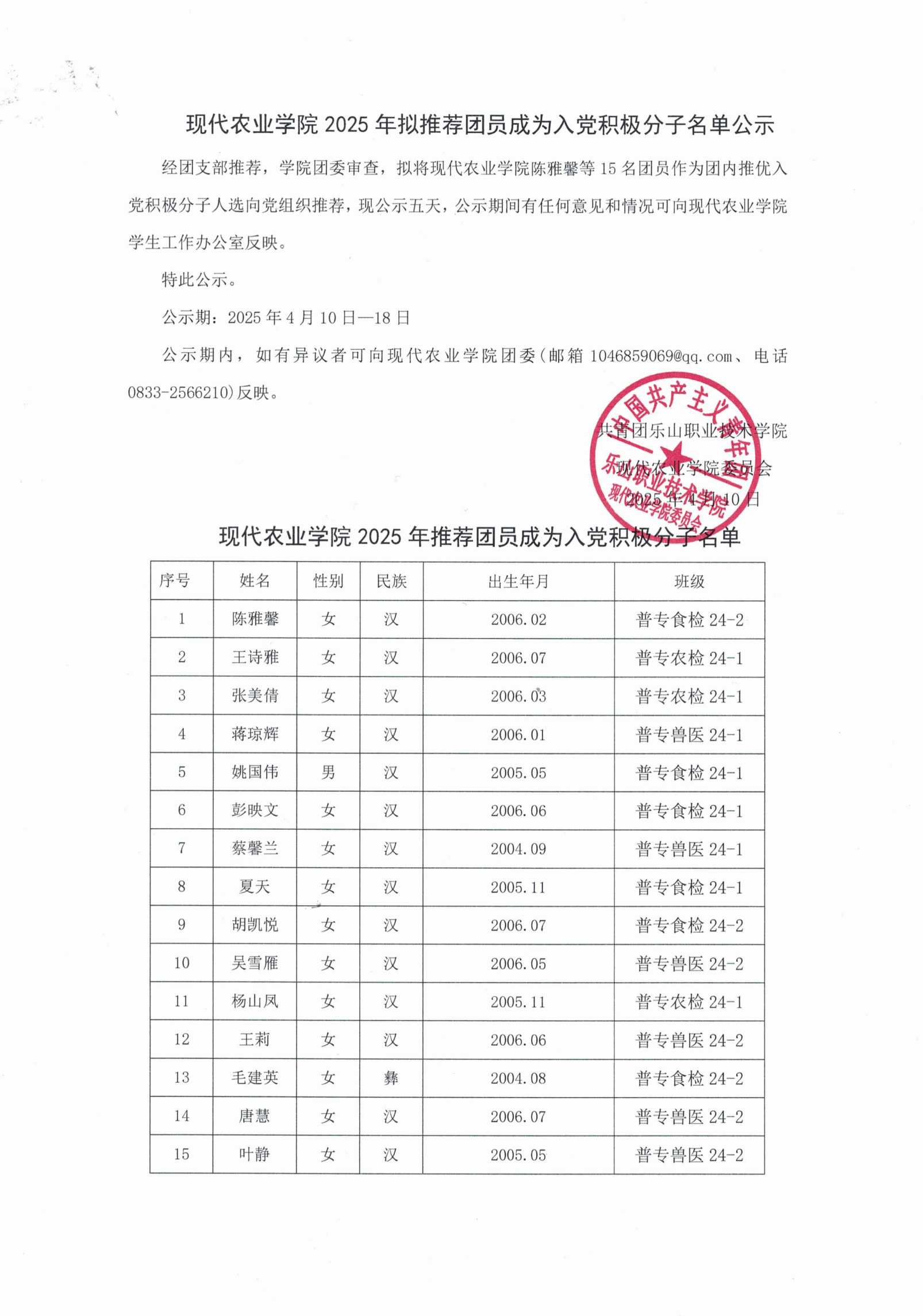 现代农业学院2025年拟推荐团员成为入党积极分子名单公示
