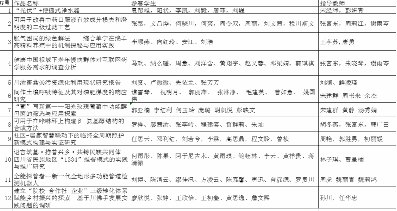 根据团省委《关于举办第十八届“挑战杯”四川省大学生课外学术科技作品竞赛的通知》,经二级学院团委推荐、校内外专家评审,现将拟推荐参加第十八届“挑战杯”四川省大学生课外学术科技作品竞赛的作品进行公示。