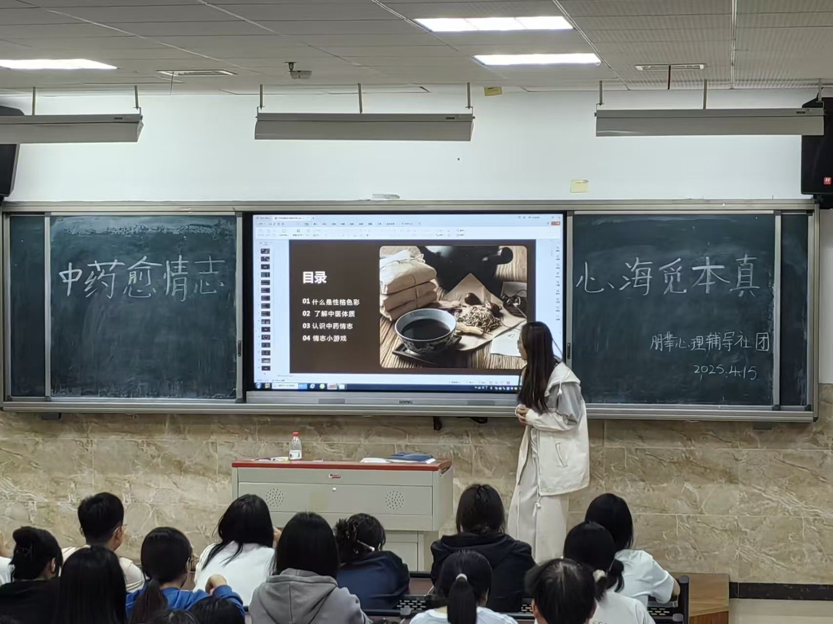为帮助大学生更好地认识自我、接纳自我,提升情绪管理和人际交往能力,营造积极健康的校园心理氛围,8797威尼斯老品牌朋辈心理辅导于 2025 年 4 月 16 日 在 2c103 举办了“中药愈情志,心海觅本真”主题活动,活动吸引了全校 100 名学生踊跃参与。