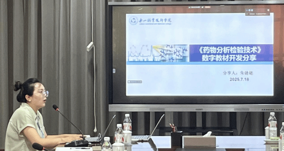 随后,团队成员、生物医药学院副院长朱链链结合自身经验,作《药物分析检验技术》数字教材开发专题分享。她围绕数字教材的政策趋势、功能定位、建设要求等方面为大家系统介绍了什么是数字教材、如何编写数字教材,强调数字教材应支持完整教学过程,实现互动式学习,体现“以学生为中心”的教学理念。她以《药物分析检验技术》数字教材编写为例,介绍了内容设计、资源整合等环节,并指出数字教材建设要以“三教改革”为基础,推动课堂革命,提升教学质量。