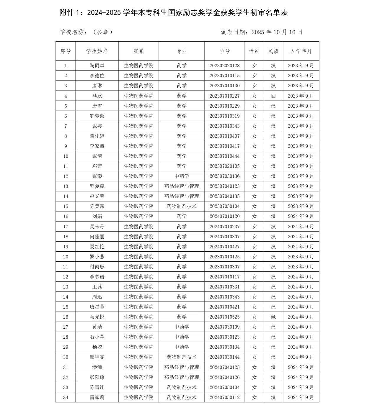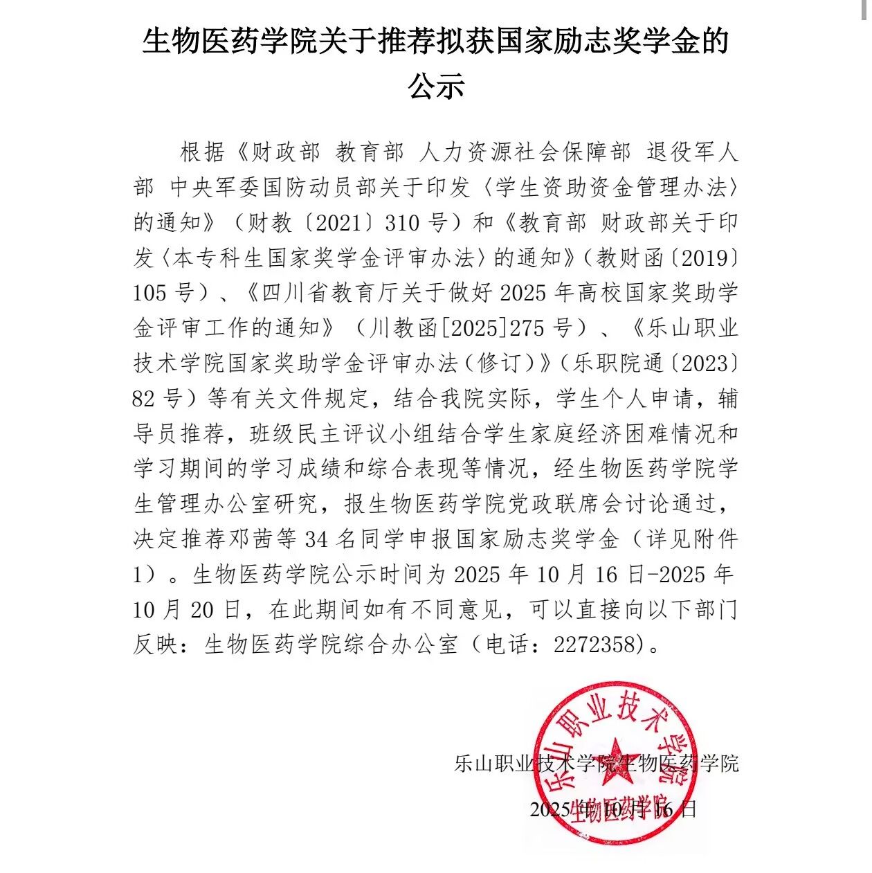 生物医药学院关于推荐拟获国家励志奖学金的 公示